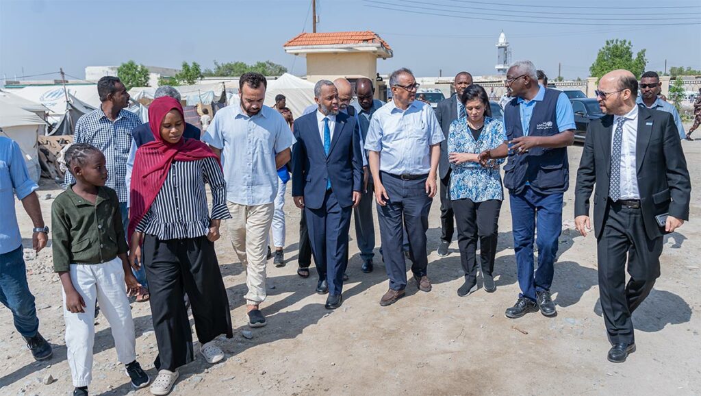 At an internally displaced persons camp, Dr Tedros and Dr Balkhy saw the difficult living conditions the people face. The camp’s residents are struggling with a lack of food, medicine, and clean water, exposing them to heightened risk of disease outbreaks and other health threats. The daily risks include threat of gender-based violence, particularly against the estimated four million women and girls at risk due to the ongoing conflict.